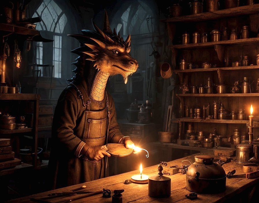 Dragon-Headed Figure in Alchemical Workshop Setting