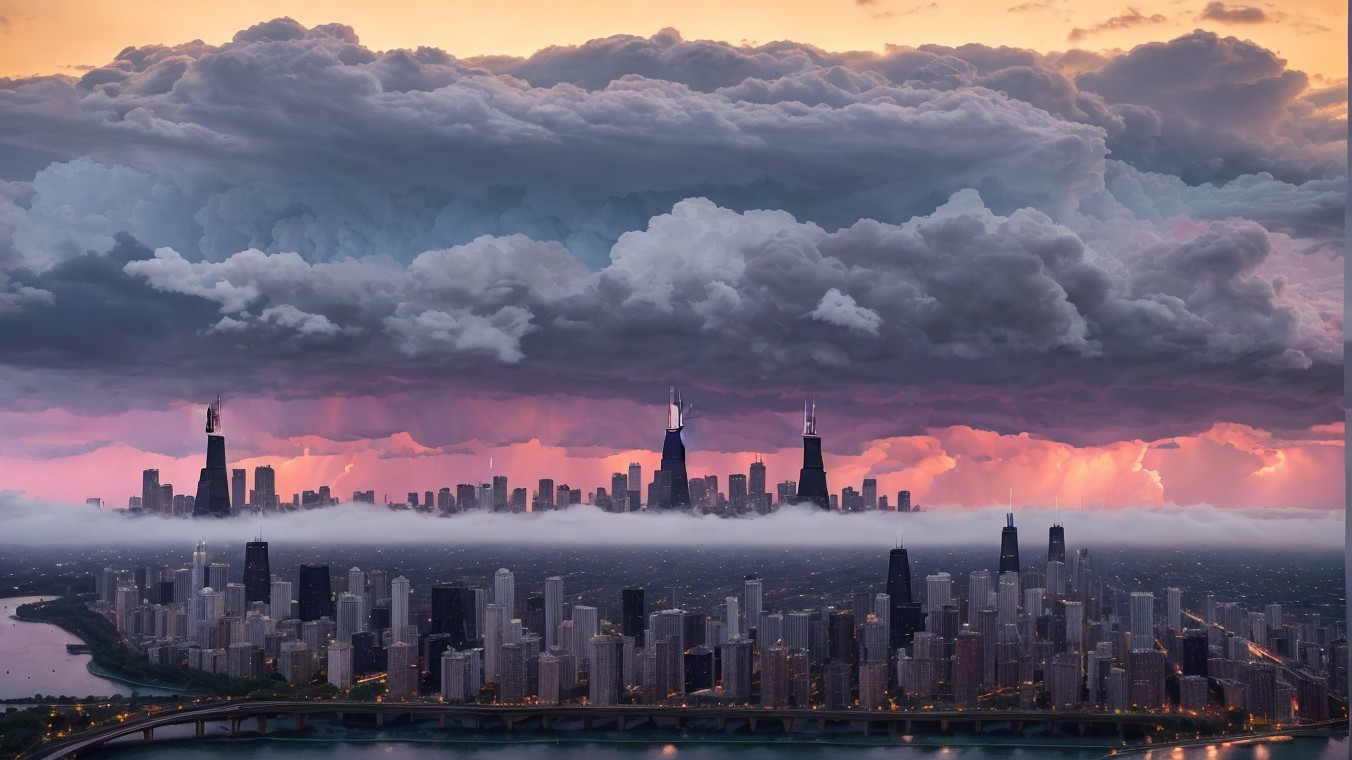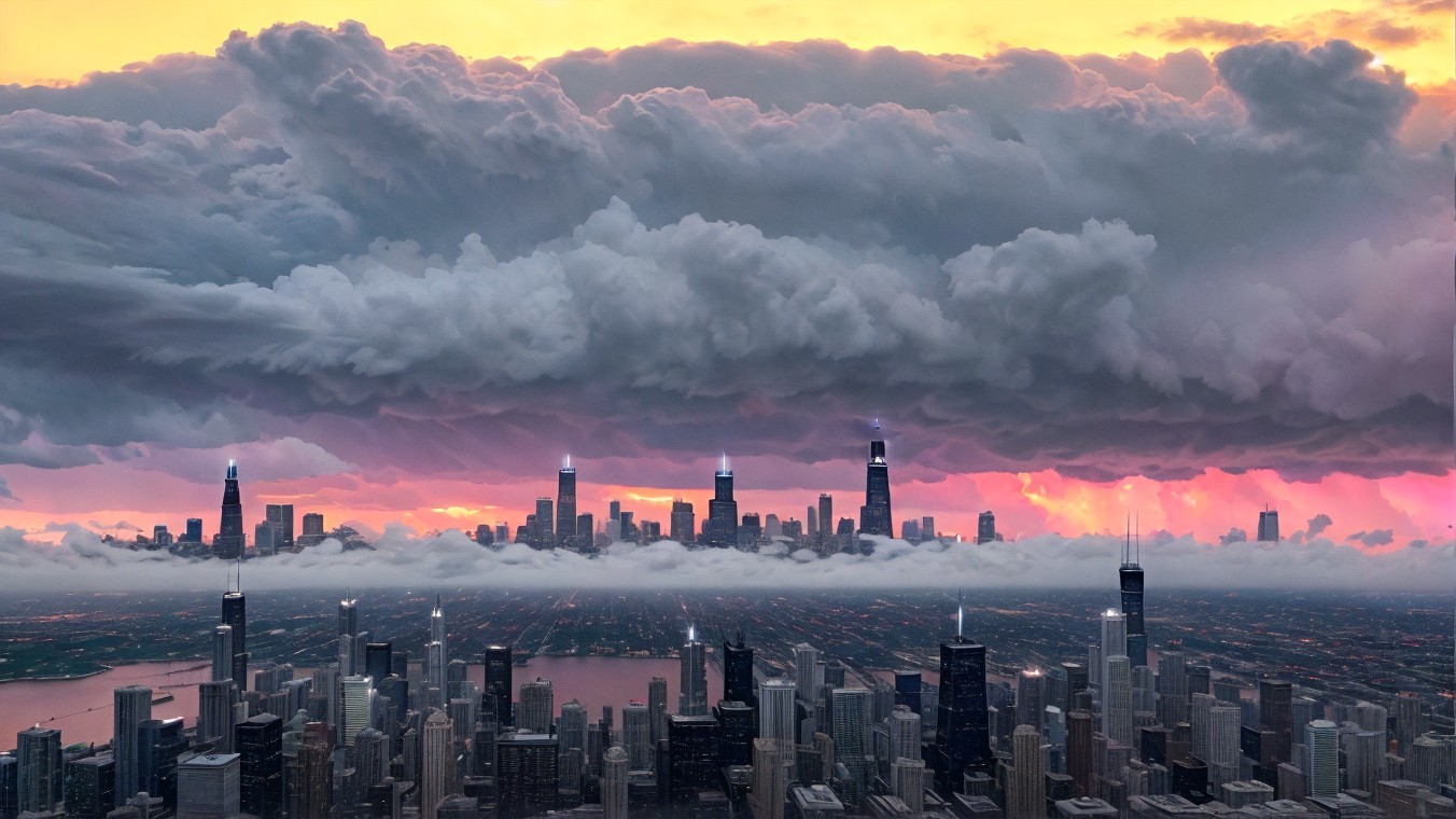 A city skyline at sunset with dramatic, low-hanging clouds reflecting the fading light.