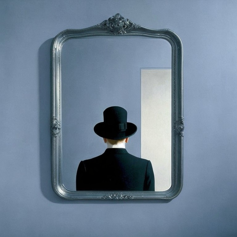 Person in black suit and bowler hat facing mirror reflecting blank wall