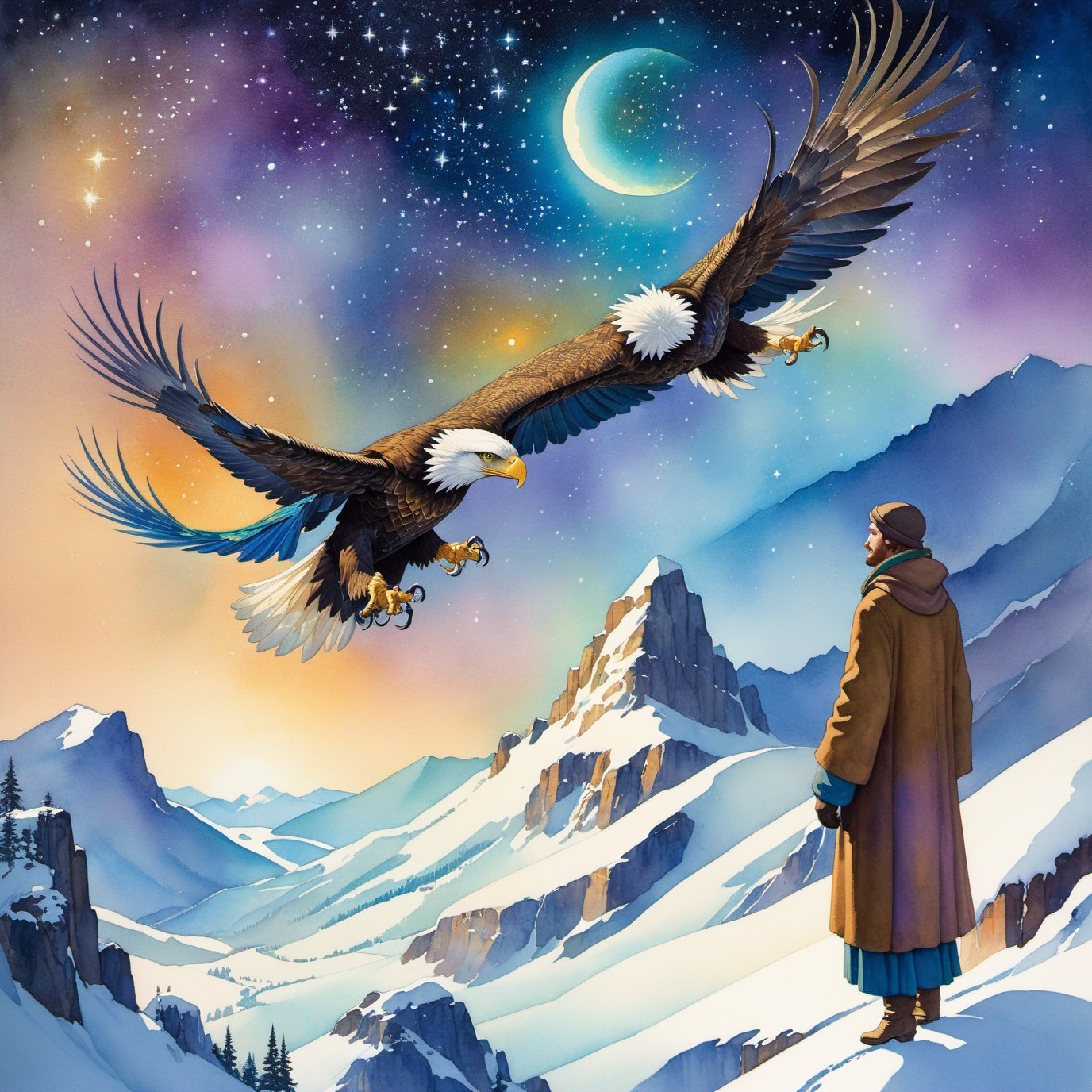 Prompt: Enhance! an eagle flying, surreal, winter.watercolour on silk, starry night, snowy hills, Mystery, style by Thomas Wells Schaller, Maxfield Parrish and Ivan Bilibin, colourful, intricate, magical, elegant, beautiful, bioluminescent highlights and atmosphere, crisp quality, Daniel Merriam art station. Mystery. in iridescent texture patchwork, acrylic art, Art Deco, Annigoni, Egon Schiele, Botticelli, Catrin Welz-Stein, intricate, elegant, digital painting, concept art, smooth,Nikon D850 highly detailed intricate beautiful dynamic lighting colors 3D Award winning photography fantasy 8k beautiful