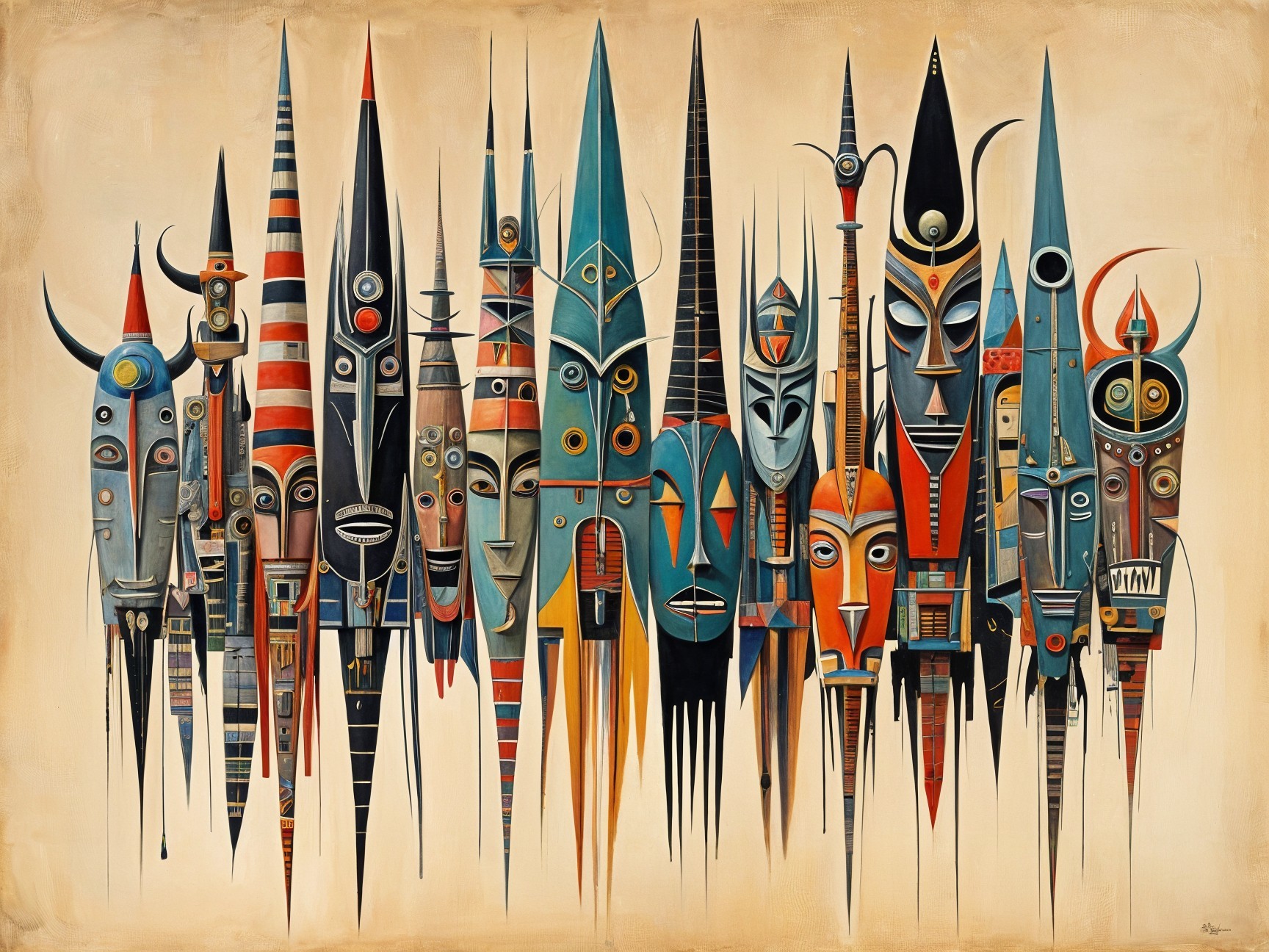 This colorful abstract artwork features a series of elongated forms with pointed tops, resembling masks or figures. The vibrant colors and geometric patterns create a striking visual impact.