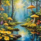 Prompt: (A masterpiece of natural landscape, ((Beautiful tropical forest, Full Scope view, sunbeams, fungus, mushrooms, Beautiful flowers, bioluminescent wild yellow flowers, water, reflections, Bright and colorful, vines, small pond, Thickly painted with a palette knife, Surrealism, Dreamy, Masterpiece, light reflections, Impressionist, Stunning color Oil drawing. Patchwork-style of Jacek Yerka and Gediminas Pranckevicius, unframed)). Full Size Image.