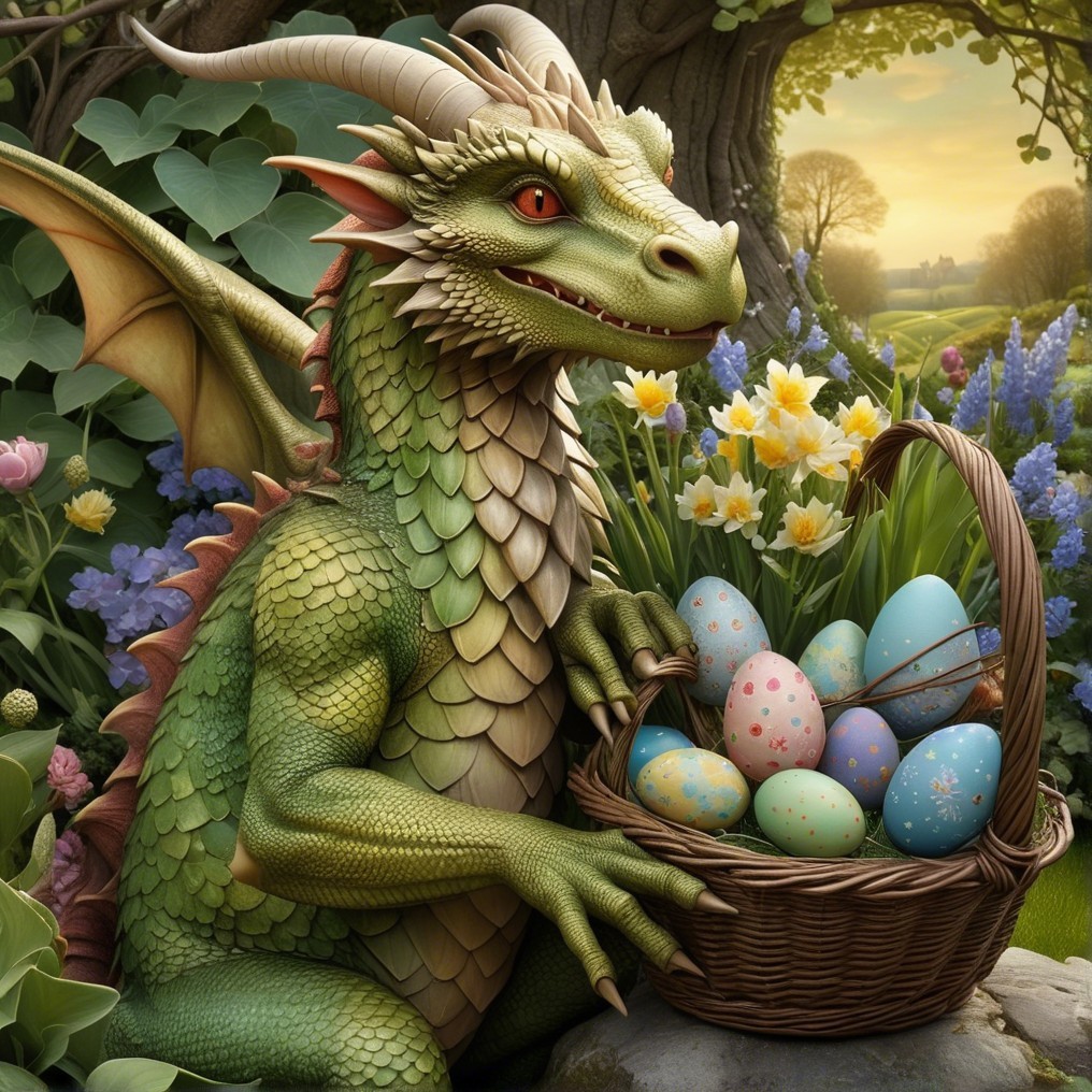 Close up, impish mischievous gorgeous Easter dragon creature sitting an a basket of Easter eggs in a luscious garden, in the style of Alexander Jansson. by Catrin Welz-Stein, Michael Parkes. By Rob Gonsalves, Markus Pierson. Bronze tones.