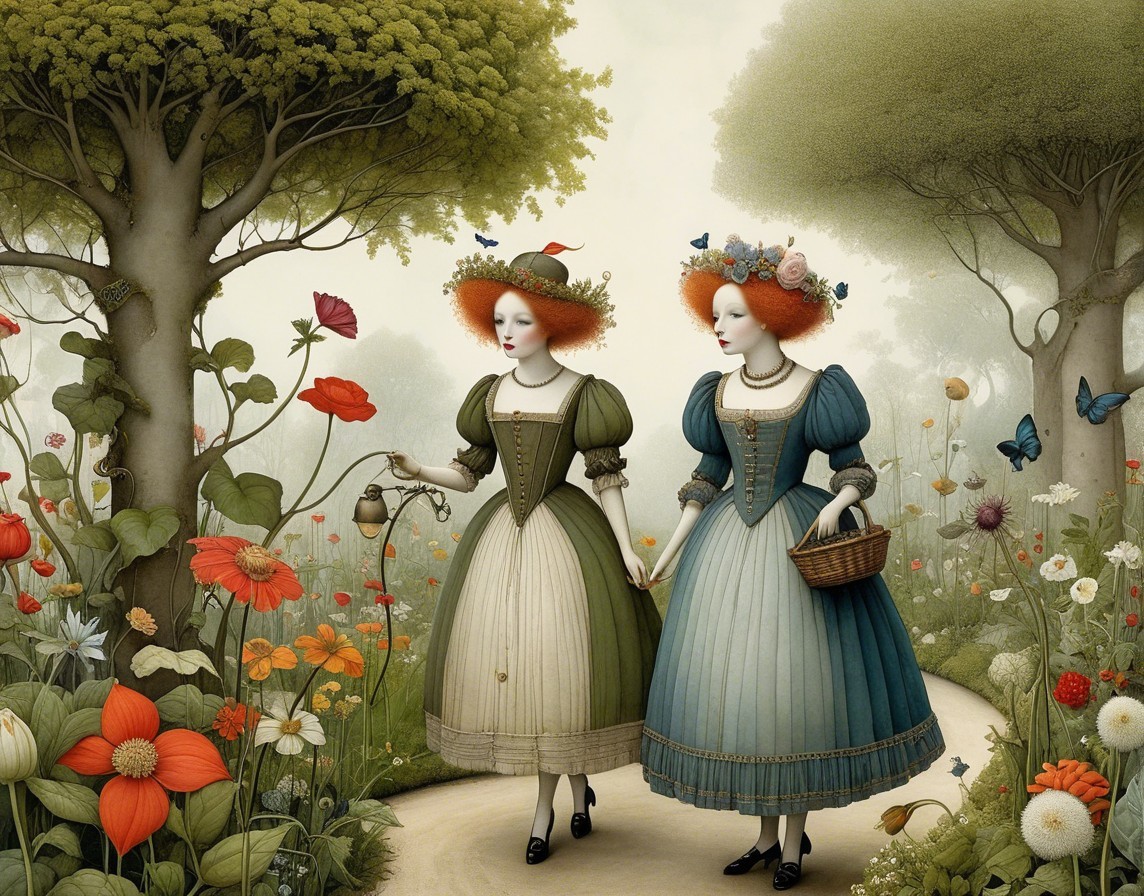 A surreal portrait of a woman with striking makeup, framed by lush greenery and white flowers. Her expression is mysterious, blending elements of nature and elegance seamlessly.