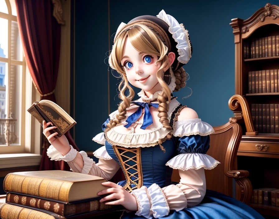 An animated maid with blonde hair in a classic blue and white outfit smiles while holding a book, a bird flying towards her near a bright window.