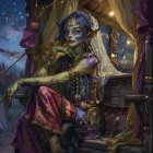 The image features a mystical goblin woman with green skin and pointed ears, adorned in vibrant purple and gold attire, set in an enchanting, magical environment filled with soft lights and colorful decor.