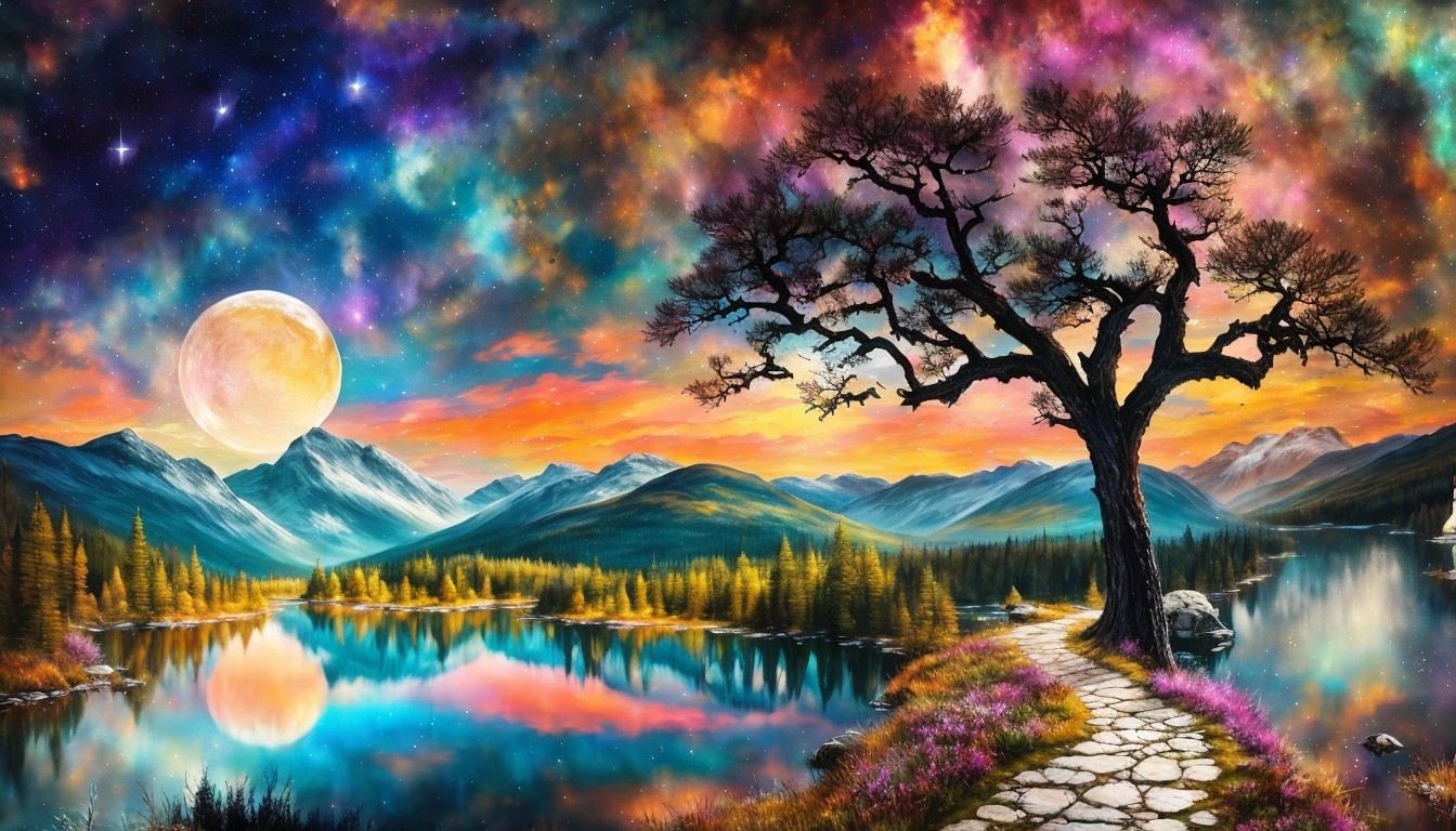 Vibrant landscape painting featuring a glowing full moon, a solitary tree, colorful cosmic sky, serene lake, and distant mountains.