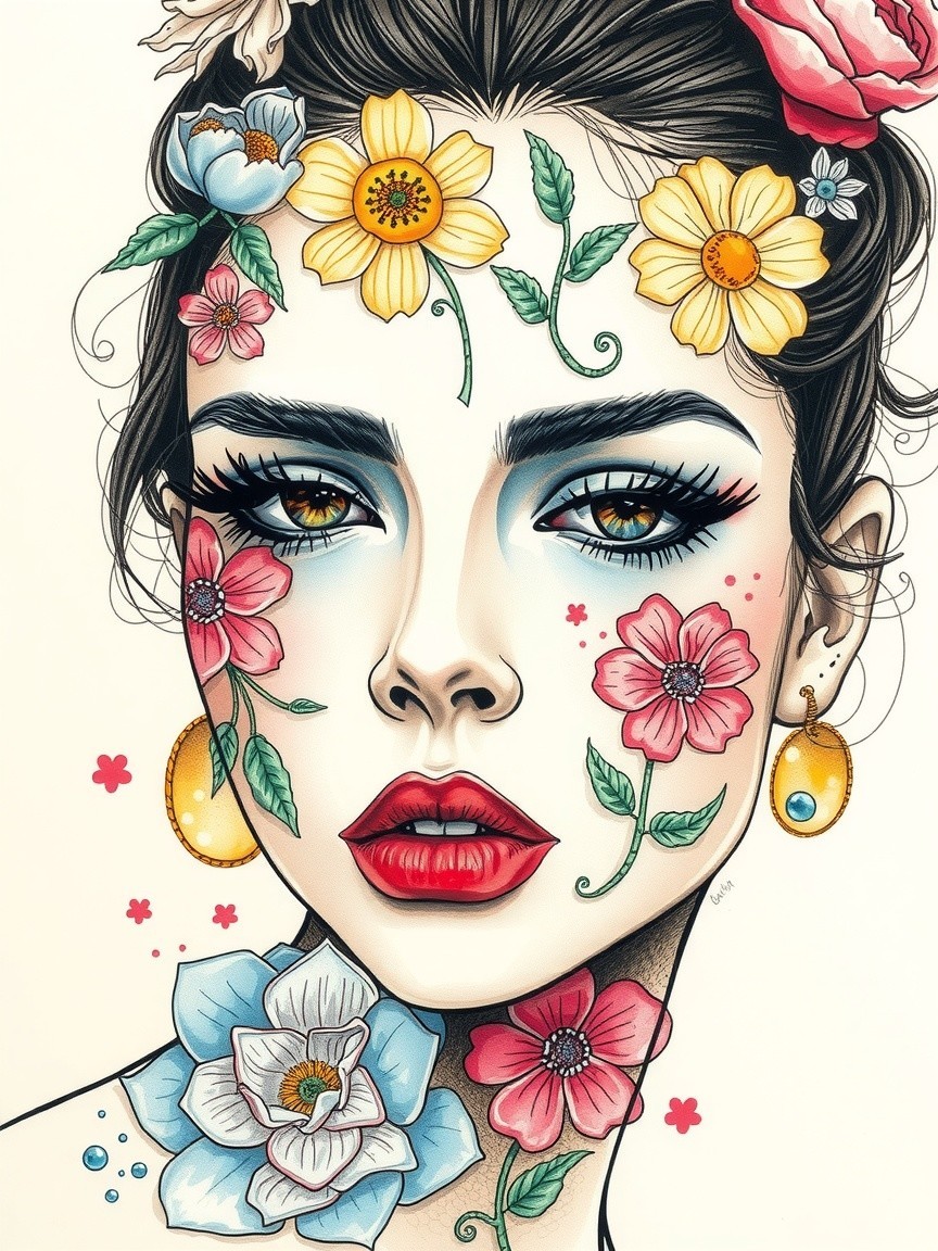 A stunning portrait of a woman adorned with colorful flowers and leaves on her face. Her expressive eyes and soft makeup enhance her beauty, complemented by elegant earrings.