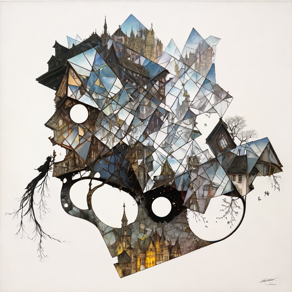 A surreal portrait blending a woman's profile with architectural elements, geometric shapes, and whimsical scenes within her silhouette.