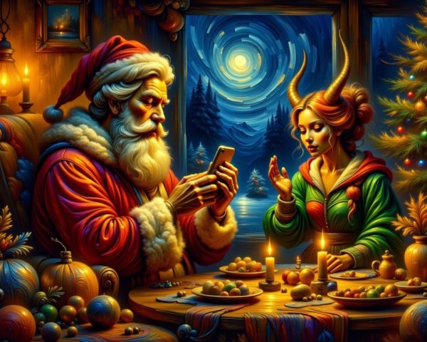 A picturesque winter scene features cozy cottages with glowing windows, surrounded by snow-covered trees and a serene, reflective river, all under a beautifully lit sky at dusk.