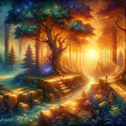 A serene forest scene at sunset, with vibrant hues of orange and blue. Deer are seen near a gentle river, surrounded by lush trees and flowers, creating a magical, tranquil atmosphere.