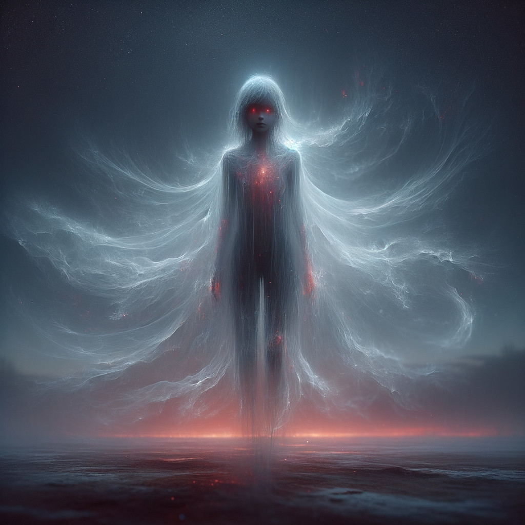 Prompt: "Ghostly childish humanoid figure with ethereal wispy body dissolving behind her as she walks towards the viewer, bloodshot red eyes, translucent body, vast open night sky, traditional Chinese ink painting style, emotional depth, sense of isolation, misty dark red background, evocative brushstrokes, atmospheric perspective, teen angst, serene and melancholic ambiance, deep artistic concept, blurred depth of field, contemplative mood, realistic photography"