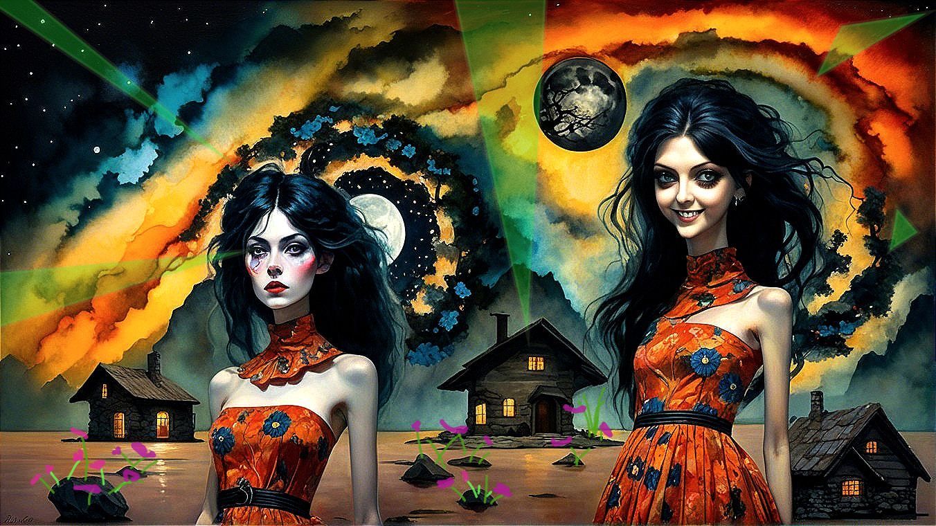 + Prompt:full moon nightscape, rocky woman-creature and a pretty scary witch, a flowery landscape by lake, reflections, trees. a combination of watercolors and oil on canvas. Fanastic style of Thomas Wells Schaller and Egon Schiele, Tim Burton, William Blake and Gustav Klimt. mIXED MEDIA. Some glass shards blended into the paints, Sky is clouds with astronomy photo details of galaxies and star clusters. cubism, picasso-inspired, beautiful woman monster hanging out by stone cabin, cosmic sky, weird shadowy creatures, by Egon Schiele, David Lynch and Tove Jansson, mixed media, miniature by Tim Burton, William Blake and Gustav Klimt. Sky is astronomy photo details of galaxies and star clusters
