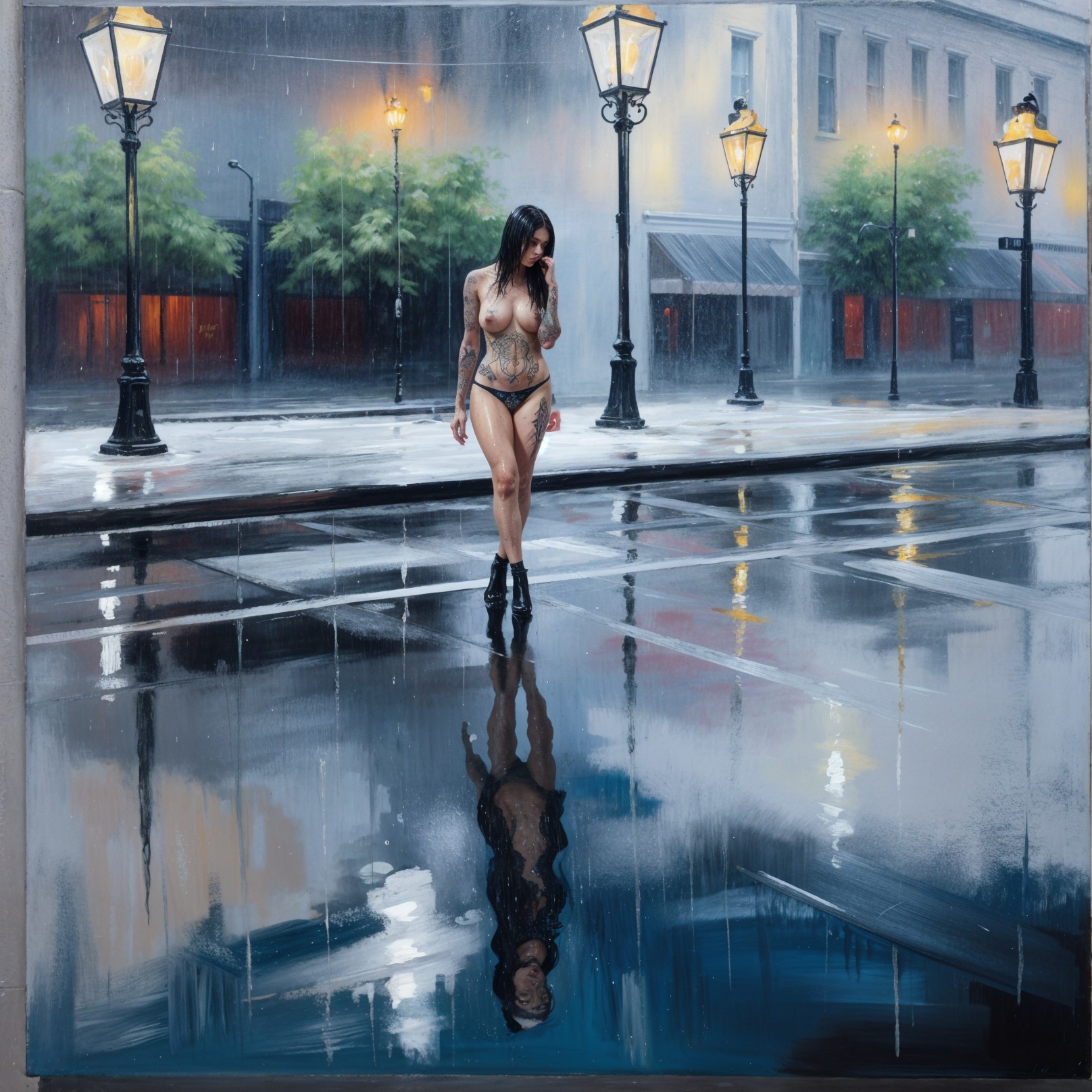 A woman with a tattoo walks alone down a rainy street, illuminated by street lamps. Her reflection shimmers in the wet pavement, creating a moody, atmospheric scene.