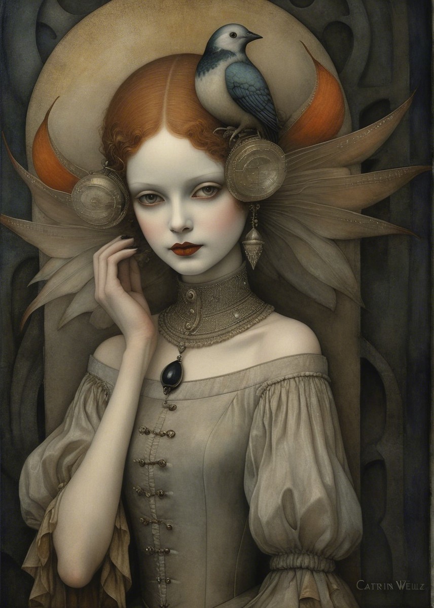 A striking figure with pale skin and red hair, adorned in an elaborate garment. She poses gracefully, wearing ornate jewelry, with a bluebird perched atop her head amidst a mystical backdrop.