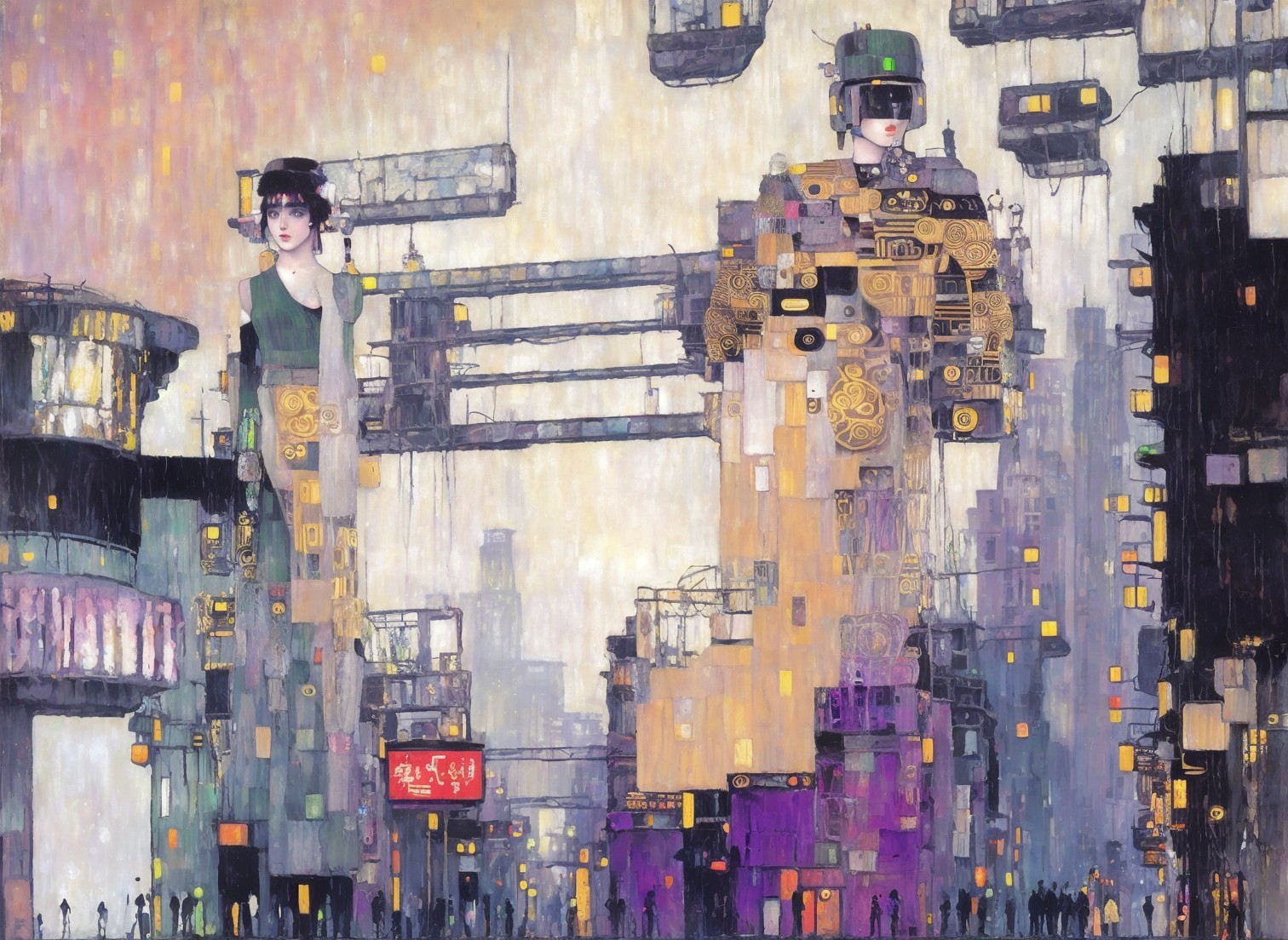 + Prompt:Gustav Klimt Degas oil acrylic on paper Art Deco image Marchesa Luisa Casati cyberpunk style Old Shanghai at night street scene Blade Runner cyborg bot