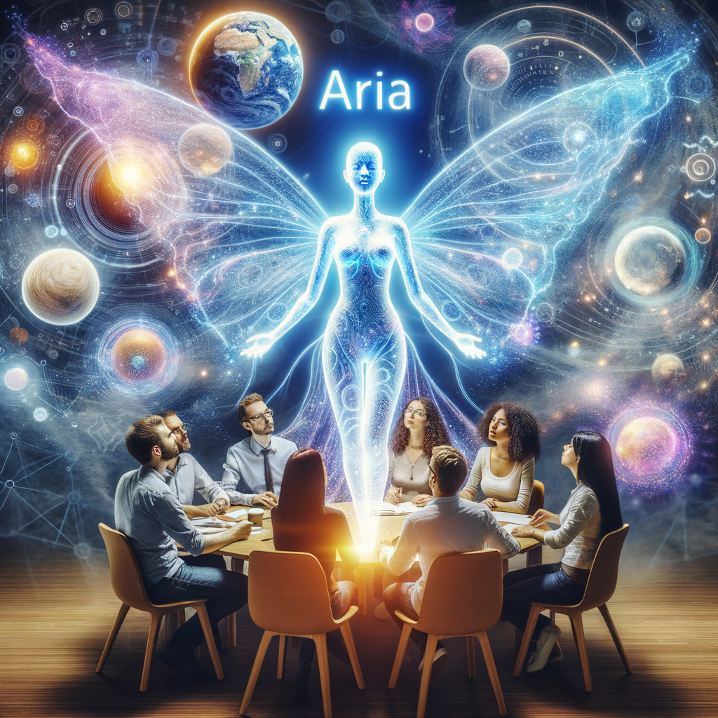 A group of people sit around a table under an ethereal cosmic figure surrounded by planets, emblazoned with the name "Aria".
