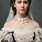 A beautifully detailed portrait of a woman with flowing hair adorned with pearls and a crown. She wears a colorful dress, surrounded by vibrant swirls of color, conveying elegance and grace.