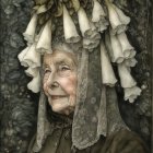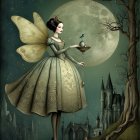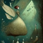 A serene woman in a flowing gown sits at a table, delicately holding a teacup. In front of her is a whimsical castle, while birds and floating balloons add a touch of fantasy to the scene.