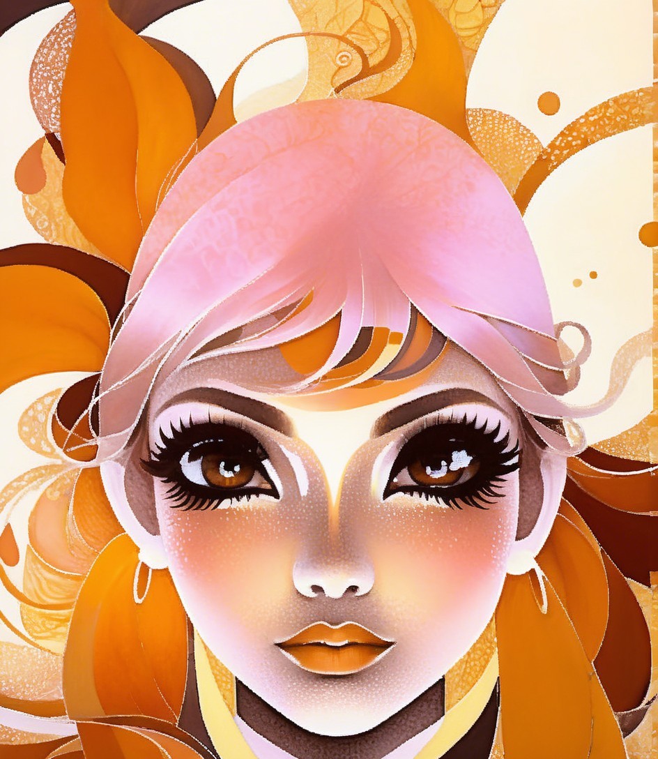 A striking portrait of a young woman with large, expressive eyes and flowing hair, adorned with warm tones of orange and pink, set against a vibrant, abstract background.