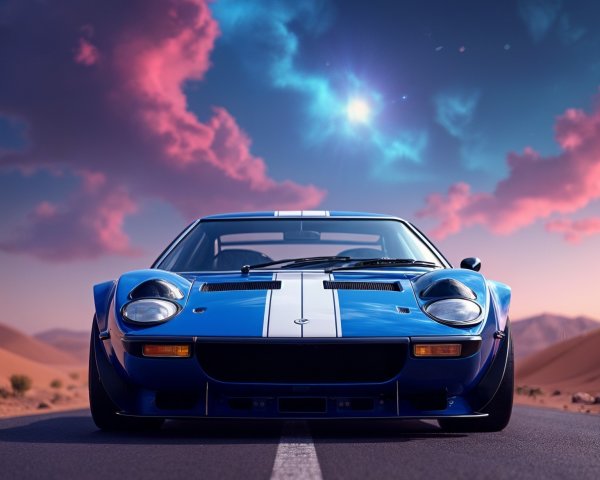 A vibrant blue vintage truck with a white grille and red accents is parked against a stunning sunset, proudly displaying an American flag. The scene captures a classic Americana vibe.