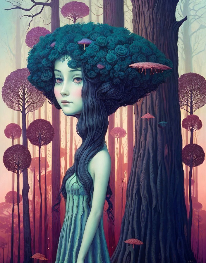 A surreal illustration of a woman with a mystical forest with trees and mushrooms echoing her hairstyle.