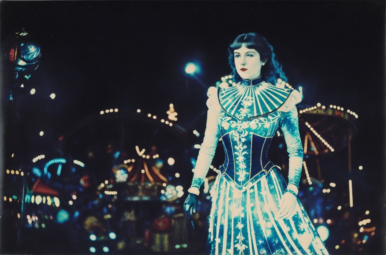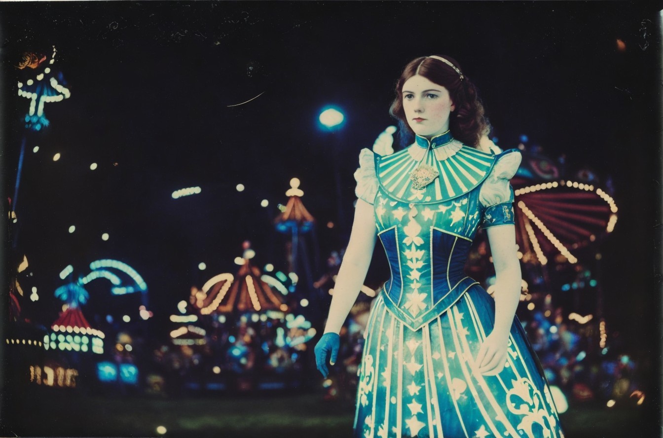 A woman in a vintage, illuminated costume stands before a blurred, festive background with twinkling lights and a carousel.