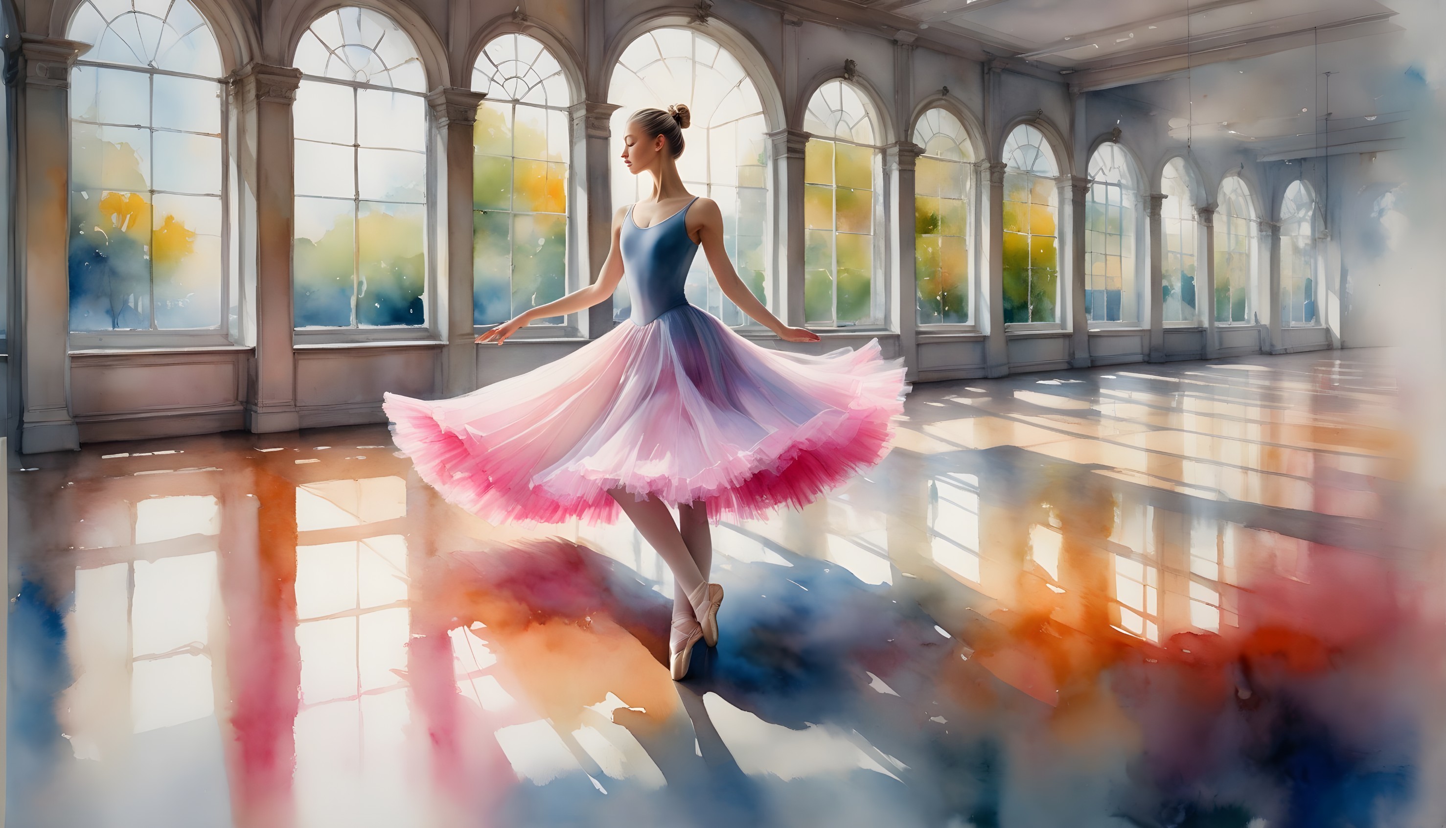 A ballerina poses gracefully in a sunlit hall with large windows, reflecting colorful floor and airy ambiance.