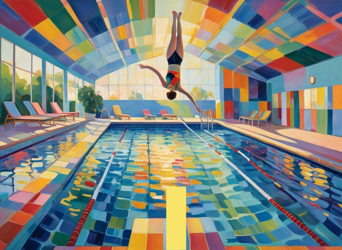 Prompt: Swimming pool with a person diving from a high yellow diving board at one end. Oil painting in the style of David Hockney, Raoul Dufy, Sonia Delaunay