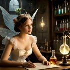 A young woman in a colorful bikini stands by the water, gazing thoughtfully. Hanging light bulbs illuminate the scene, adding a magical ambiance against a backdrop of dramatic cliffs and ocean waves.