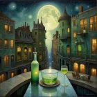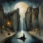 A silhouette of a woman stands by a moonlit river, surrounded by barren trees. A large, shadowy bird looms above, creating a haunting, ethereal atmosphere against the backdrop of a glowing moon.