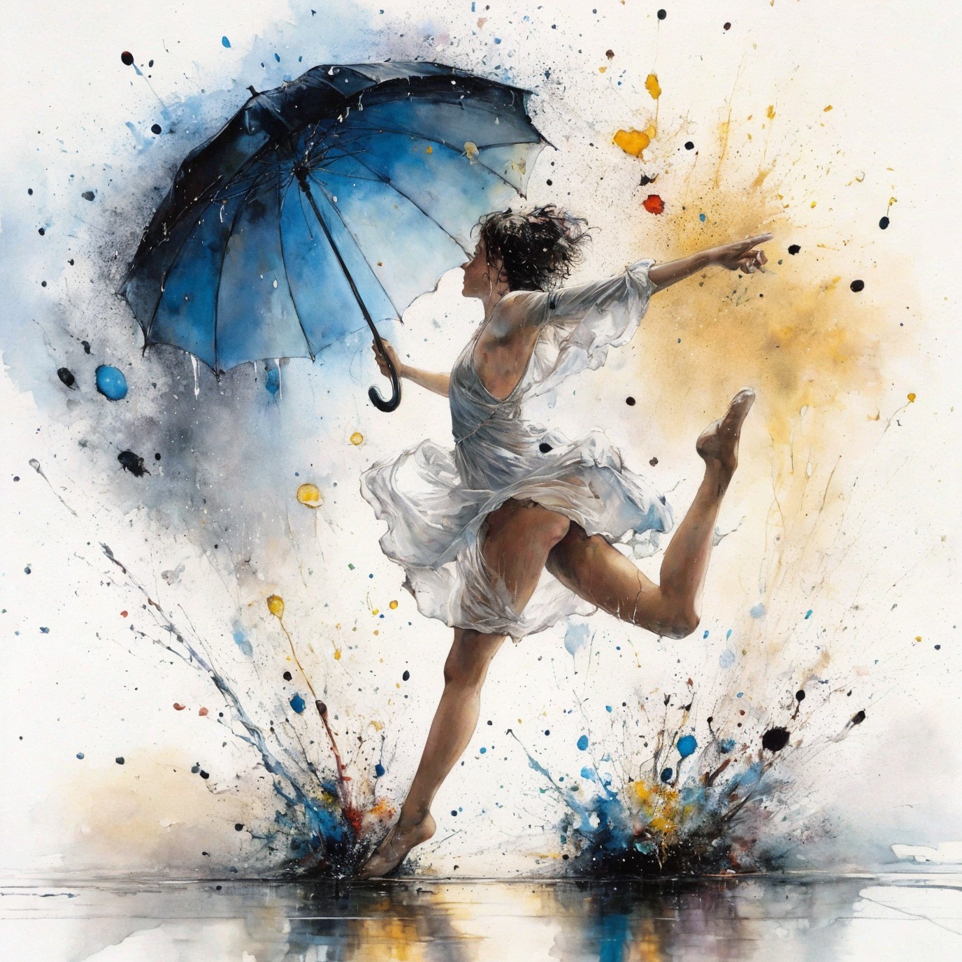 A vibrant watercolor painting of a woman joyfully dancing with an umbrella amidst splashes of colors.