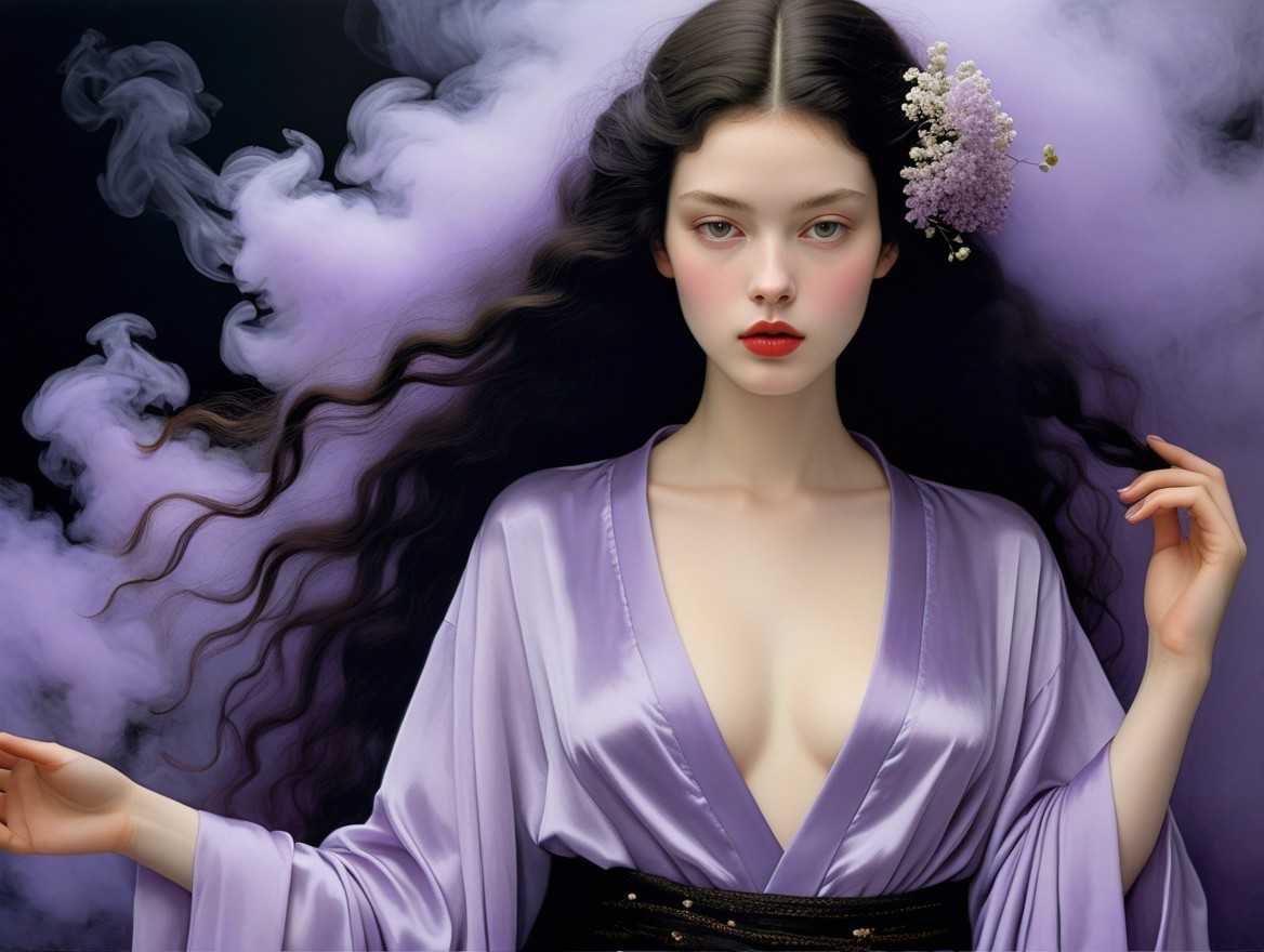 A striking figure in a flowing lavender robe, with long, dark hair adorned with a delicate flower, emerges from swirls of purple mist, exuding an ethereal and enchanting presence.