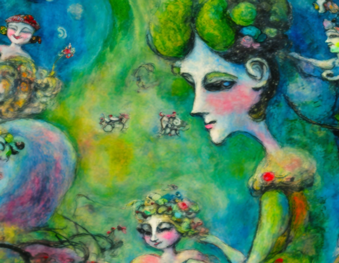The artwork features whimsical characters with exaggerated features and vibrant colors. Two figures display lush hair adorned with flowers, while a third character holds a bouquet, creating a magical vibe.