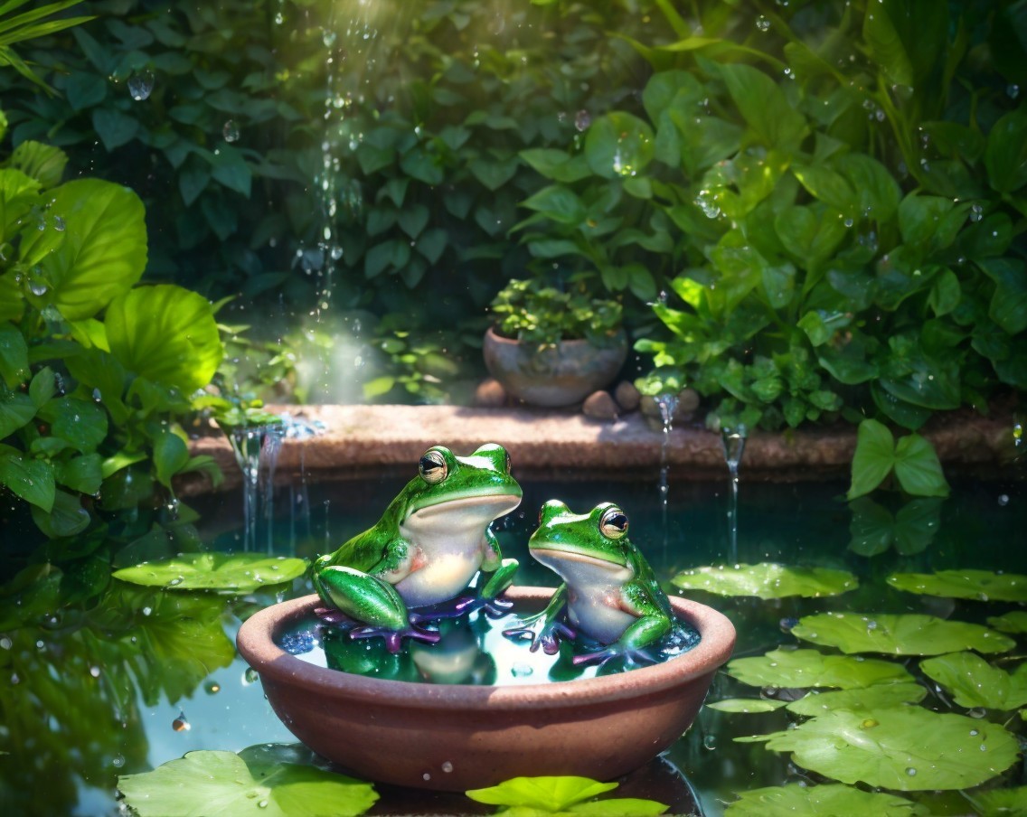 + Prompt:Vibrant green frogs, various sizes, hopping playfully, water droplets on their skin, garden setting with colorful flowers, lush greenery, ceramic bowl filled with water, reflections in the water, sunlight filtering through leaves, shadows cast on the ground, detailed textures on frogs' skin, lively and whimsical atmosphere, high-resolution, bright and natural color palette, soft natural lighting.