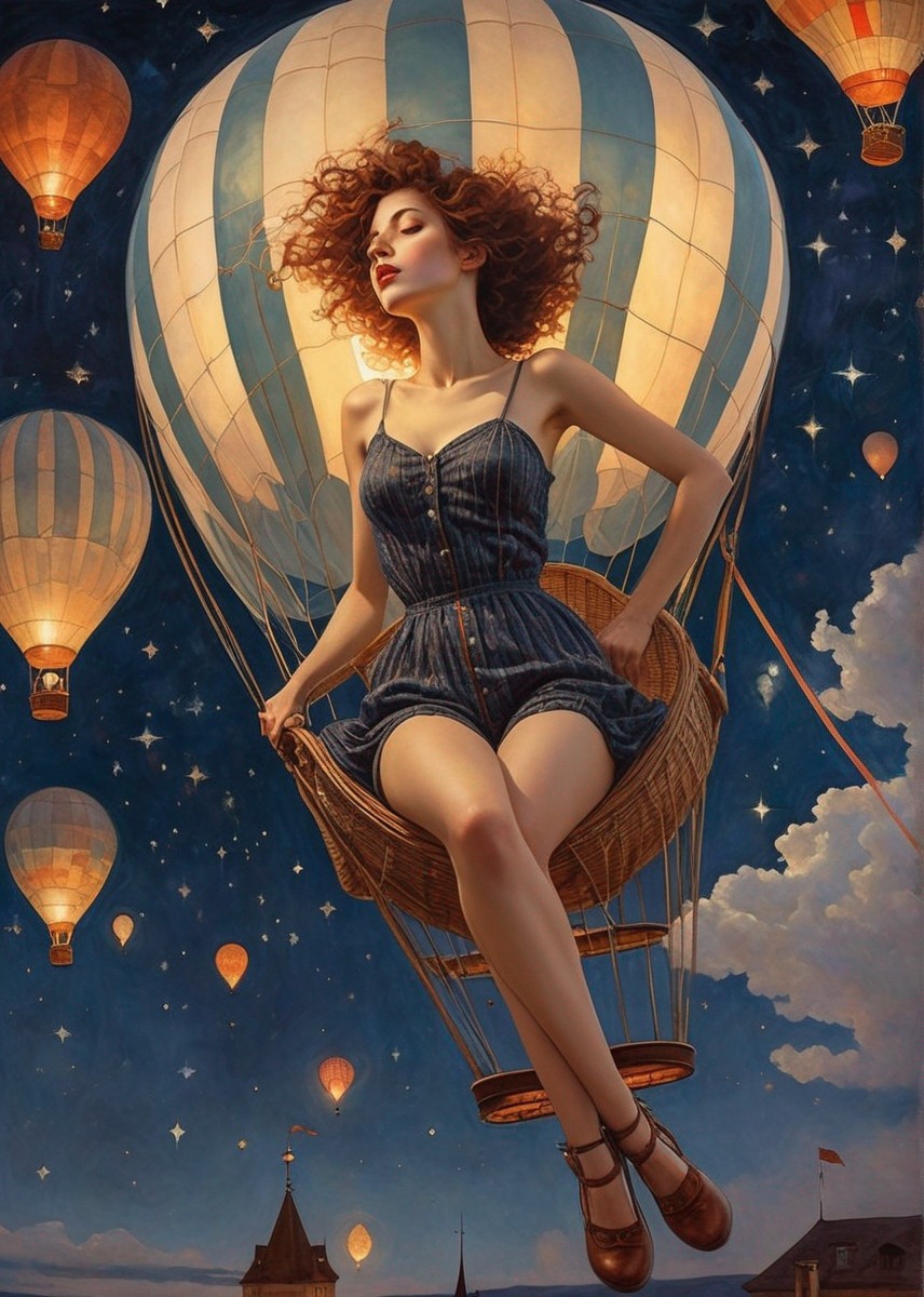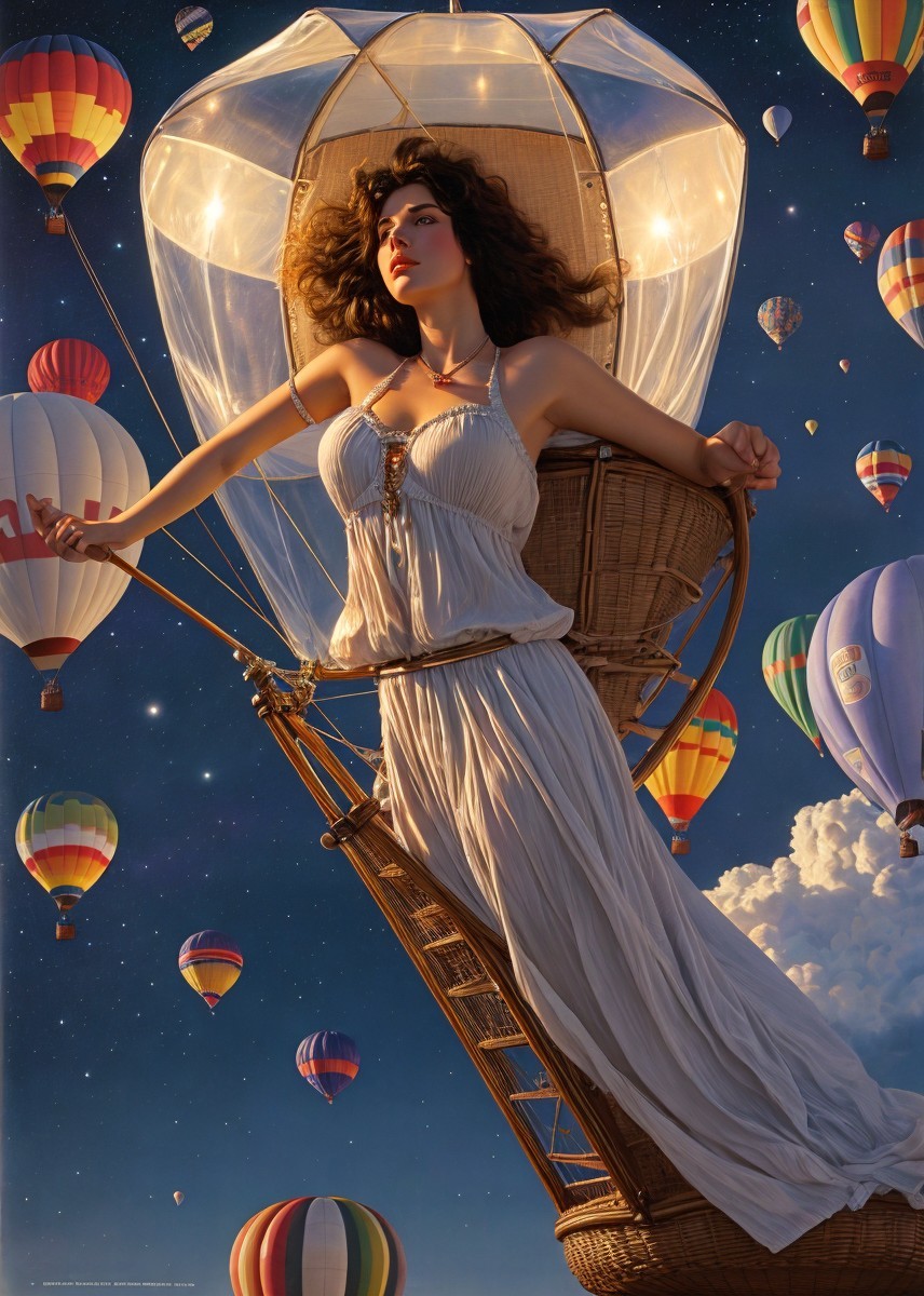 A serene artwork of a person admiring the sky from a hot air balloon, surrounded by multiple balloons against a twilight backdrop.