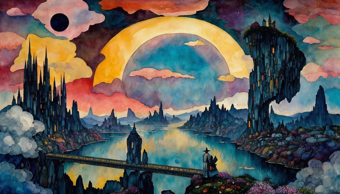 A mystical landscape features a figure in a cloak standing by a serene lake, illuminated by a large moon and vibrant planets in a starry sky. Fantasy castles and blooming flowers enhance the scene.