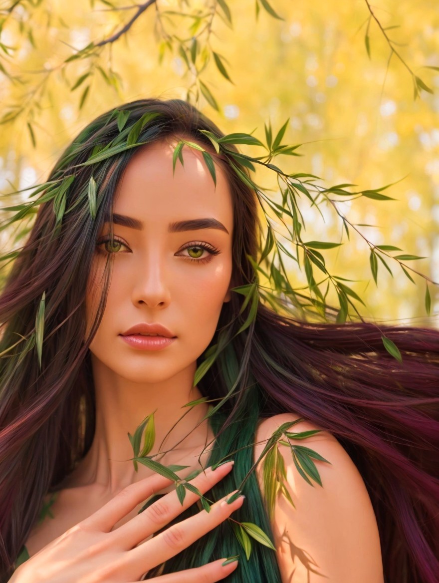 A young woman with long, flowing hair featuring green and dark hues gently poses among vibrant green leaves. Her striking green eyes and soft expression create a captivating connection with nature.