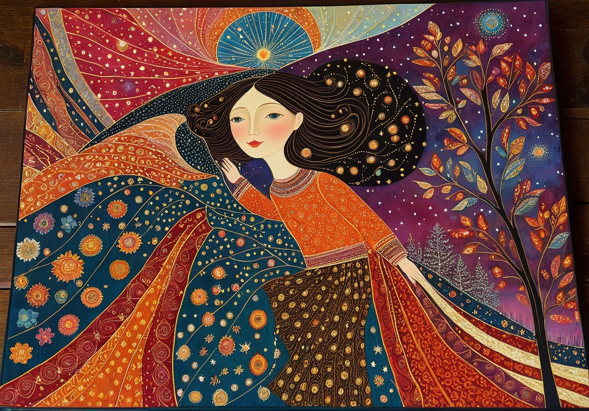 A vibrant, colorful artwork featuring a serene woman with flowing black hair, adorned in a dress with intricate patterns. The background blends starry night skies with lush nature, radiating warmth and tranquility.