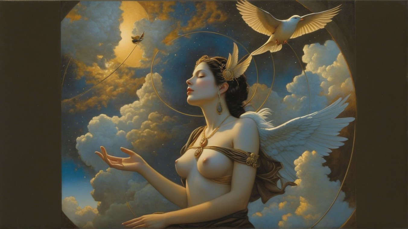 A serene woman with flowing hair and wings gazes thoughtfully, holding a golden timepiece. Ethereal clouds and a dove soar in a celestial backdrop, blending beauty and mystique.