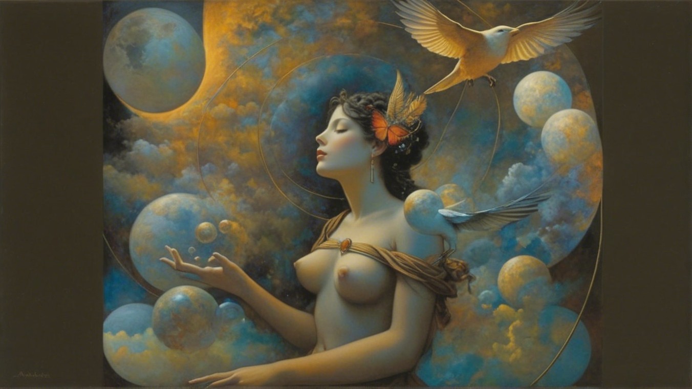 + Prompt:Charms, spells, shamans, magic. Faith is the essential ingredient. If one loses faith in a magic, one has lost everything. I haven't lived life, I haven't lived love. Just bird's eye view from the sky above". Love is a fragile thread, woven through moments. This artwork amalgamates the artistic styles of Michael Parkes,