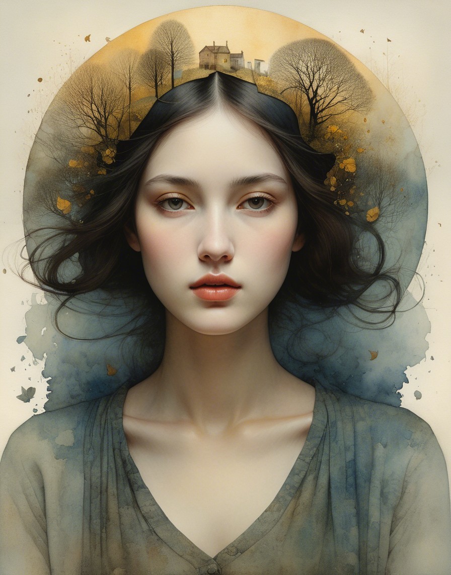 A serene portrait of a young woman surrounded by flowing hair and a halo-like backdrop. Soft pastels blend with floral elements, creating a dreamlike, ethereal atmosphere.