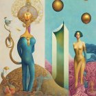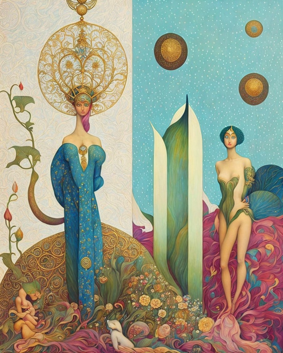 A vibrant, surreal painting featuring two elegant figures—one in blue adorned with nature motifs, the other in green—surrounded by whimsical floral elements and playful cherubs, set against a contrasting background.