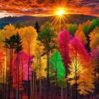 A tranquil sunset illuminates a serene landscape with vibrant autumn trees, cozy colorful houses by the water, and a small boat gliding peacefully. Nature's beauty captures a perfect moment.