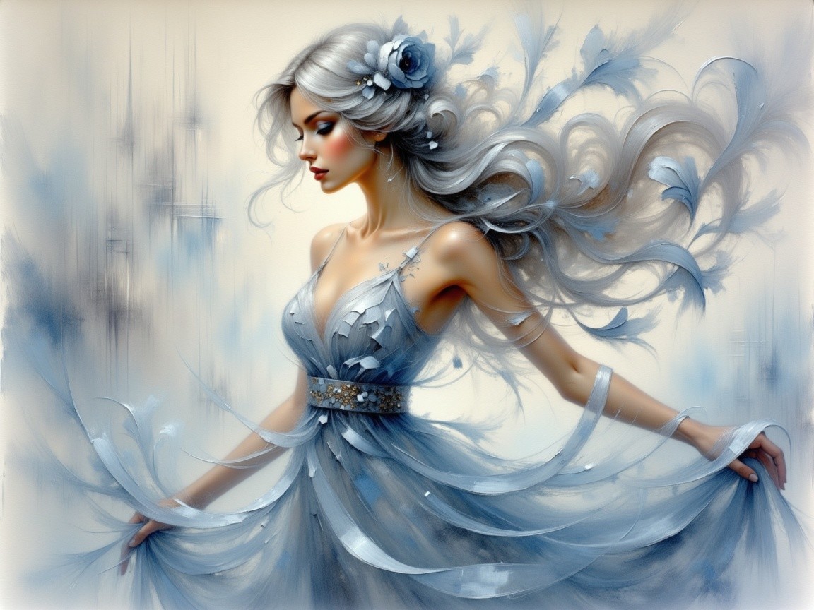 Two elegant women with long, silver hair and flowing blue gowns adorned with golden accents and rose embellishments. They exude grace and sophistication, set against a soft, dreamy backdrop.