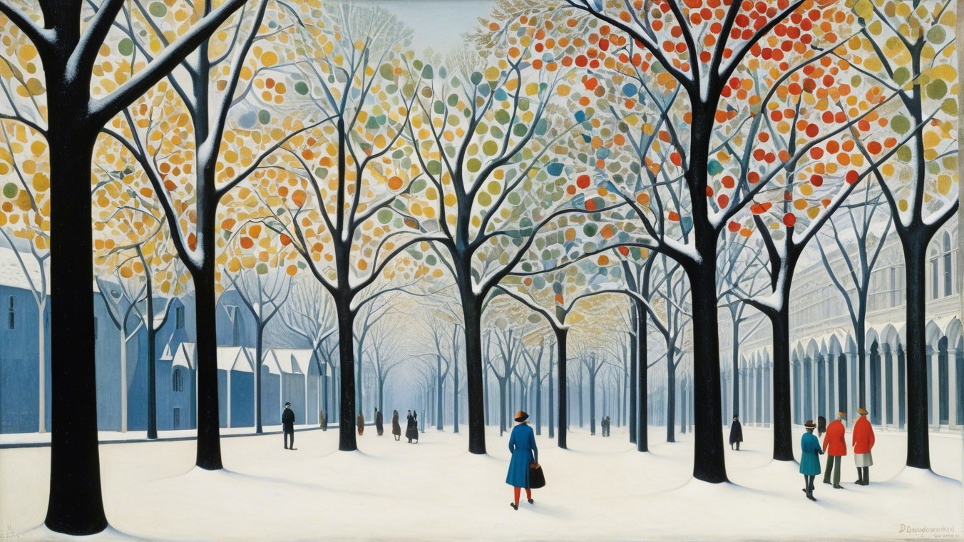 Winter Scene with Snowy Tree-Lined Avenue and People