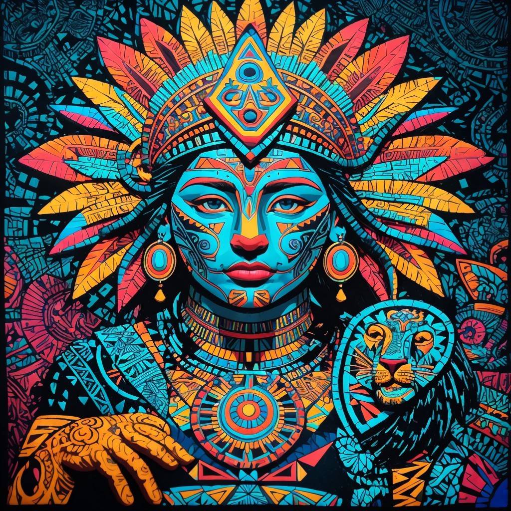 A vibrant, psychedelic portrait of a woman with blue skin, adorned in intricate Aztec-inspired headdress and jewelry, set against an elaborate patterned background.