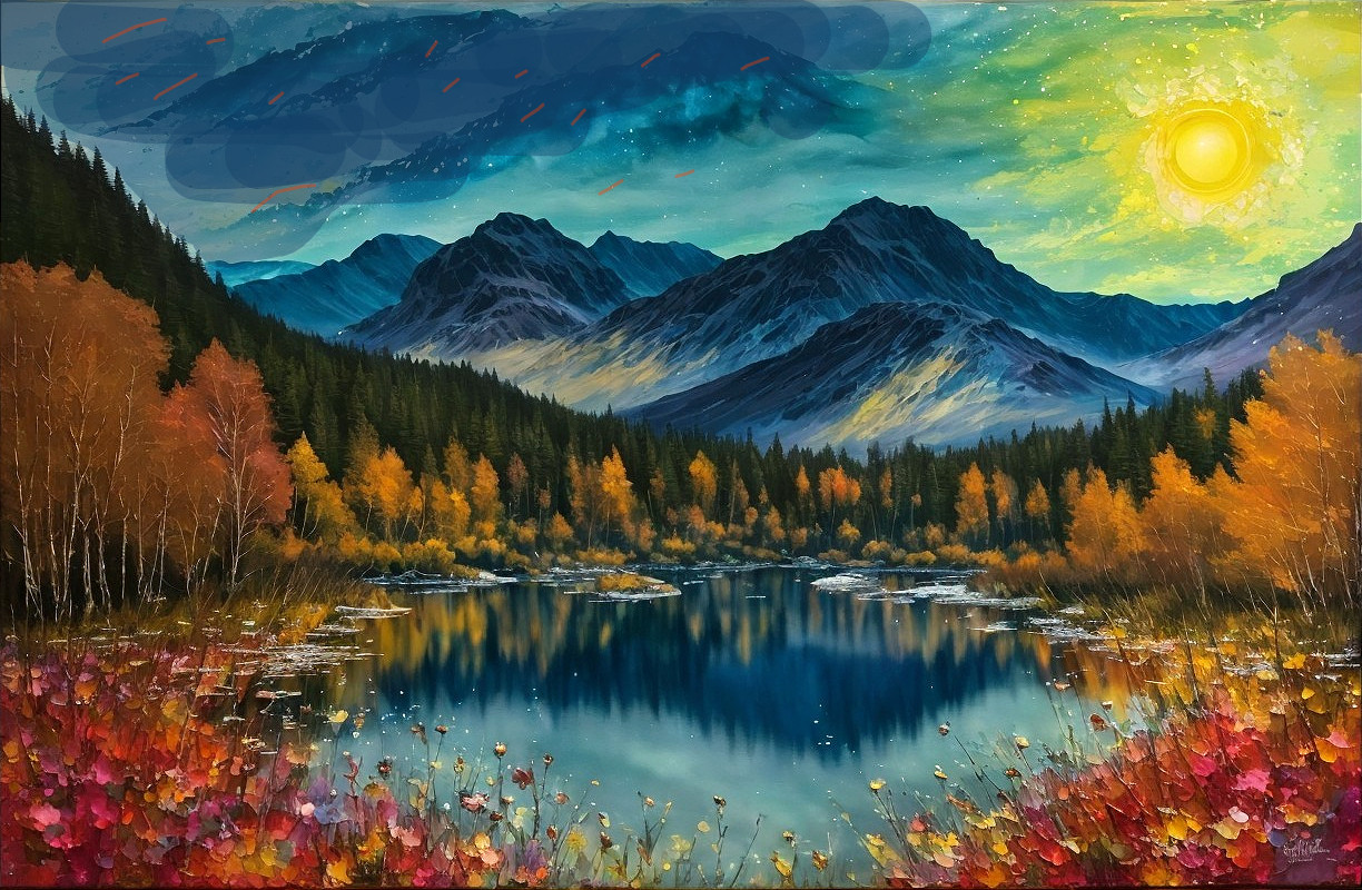 Vivid autumn forest by a tranquil lake with snowy mountains under a yellow sunset and starry twilight sky.