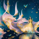 An ethereal scene features three graceful figures amidst flowing, ornate fabrics. Surrounded by vibrant butterflies, they evoke a dreamlike atmosphere of beauty and serenity against a blue backdrop.