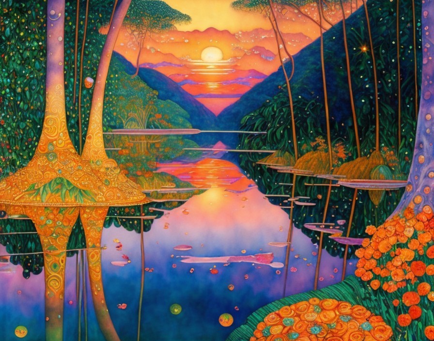 Full page, single image, 3D watercolor, fantastic Wide view, in the very best style of Gustav Klimt, a spectacular sunrise reflected in a beautiful Tingatinga style jungle river, satiny, high quality, shimmering, elegant, with vibrant spectacular colors, elegant, highly detailed, glistening magic style, by Alphonse Mucha